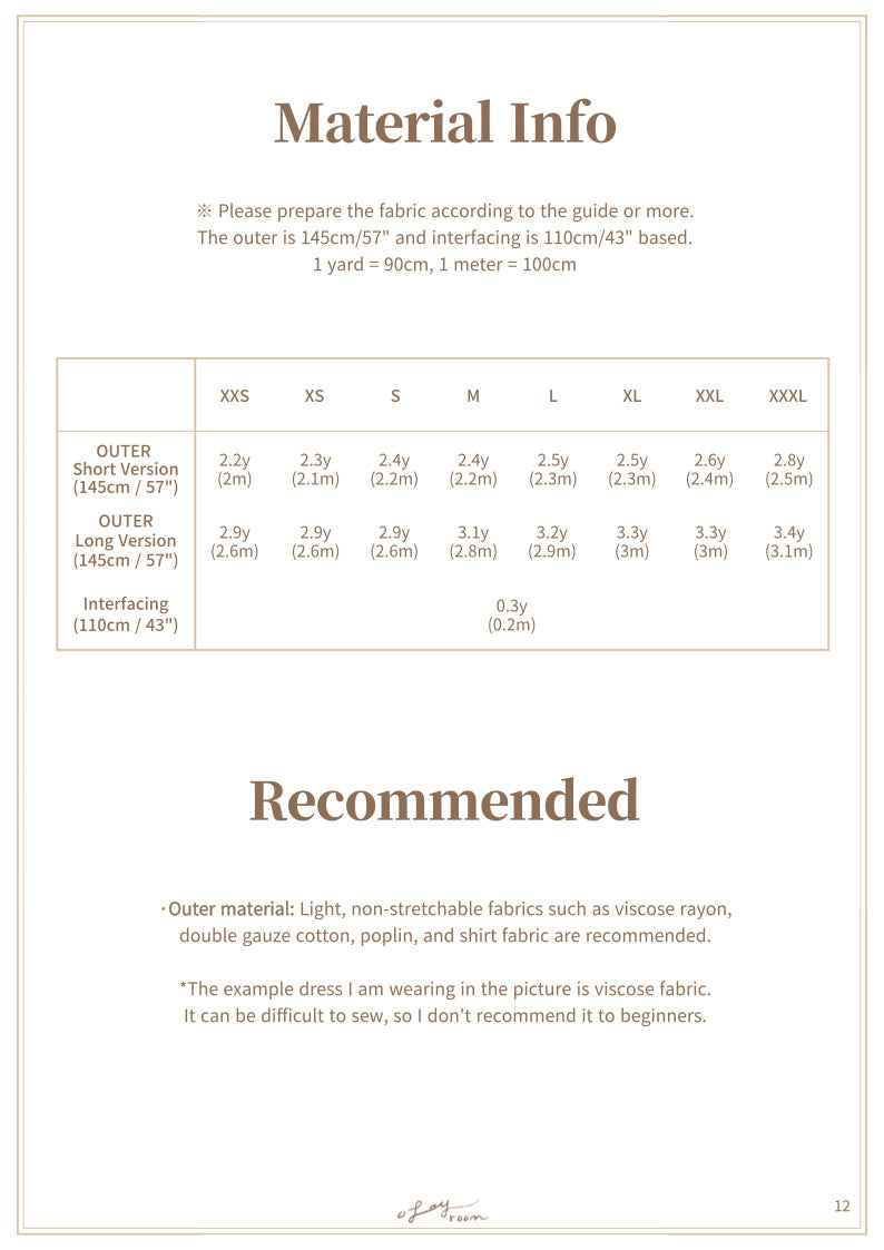 • Outer(Width 145cm/57”) Long ver: 2.9-3.4y(2.6-3m) Short ver: 2.2-2.8y(2-2.5m)