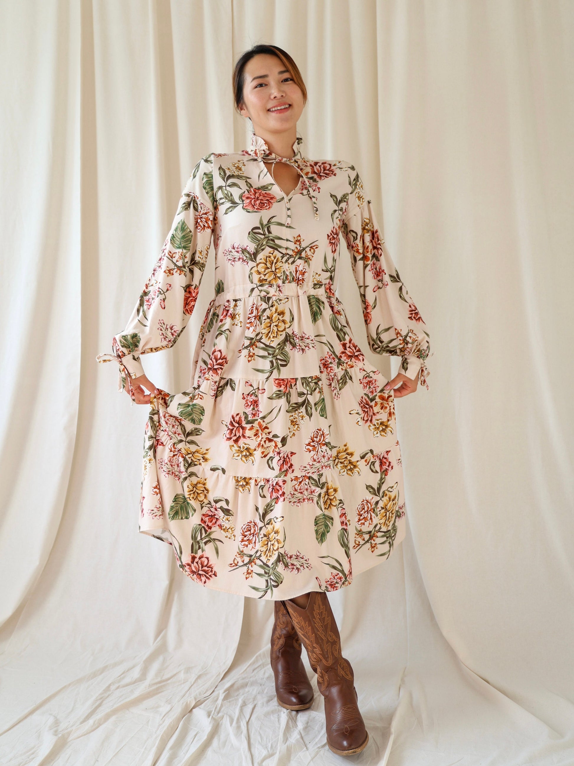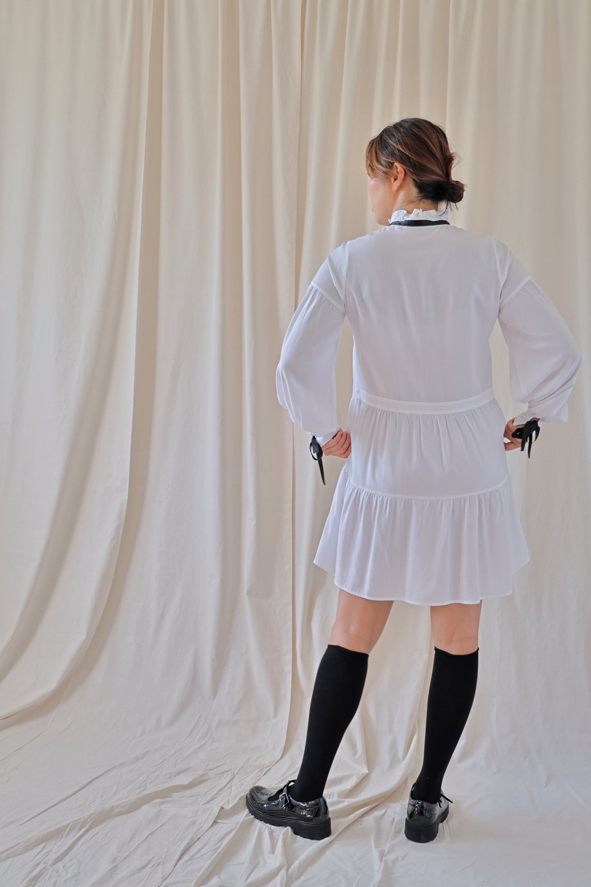 Amelia Dress is a loose fit dress that can be worn and taken off easily without a zipper or button. However, for those who like to emphasize the waistline, it includes details that can emphasize the waist by making a waist tunnel and pulling it with a string.