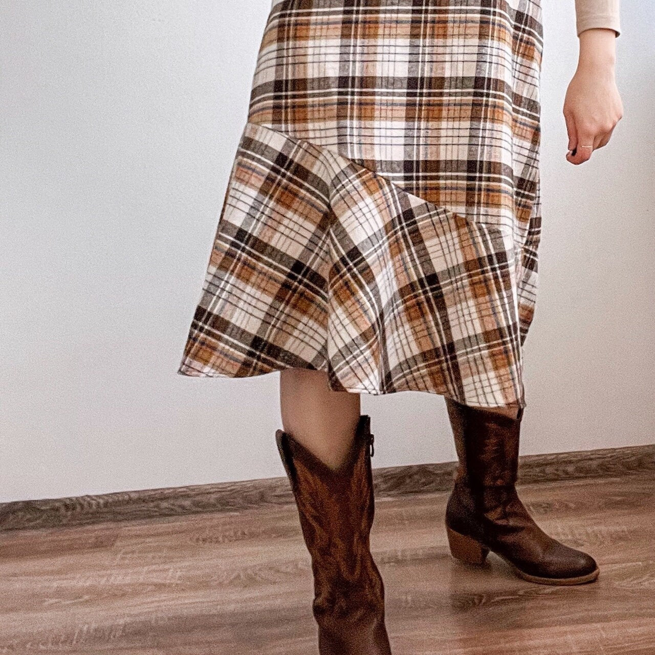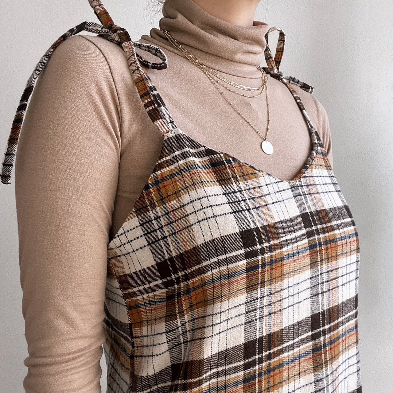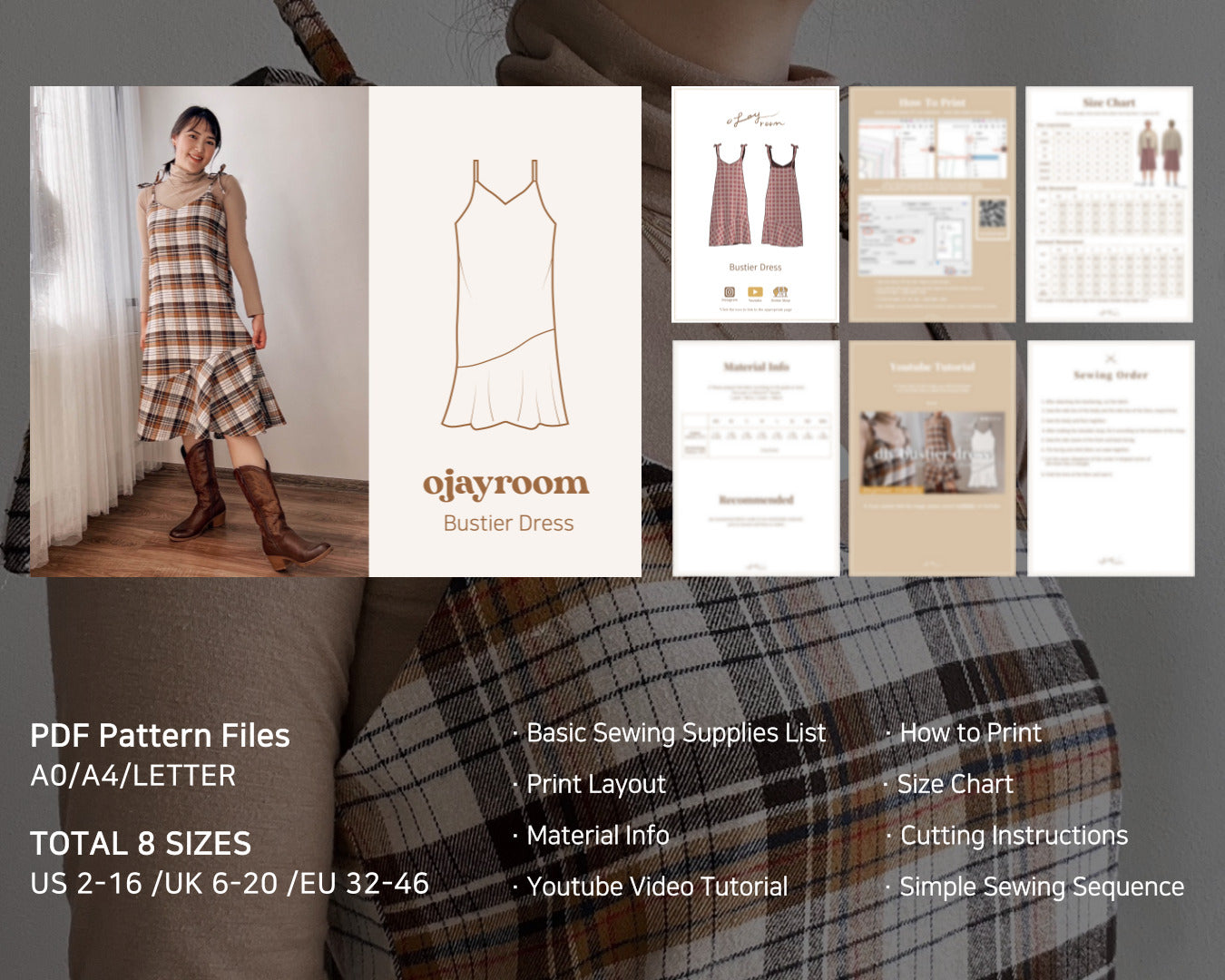 Bustier Dress is a dress that gives a feeling of fluttering when walking with an unbalanced flare at the bottom with a relaxed body. The shoulder strap can be tied at the desired height and worn comfortably over a T-shirt. The sewing difficulty is 'Beginner'.