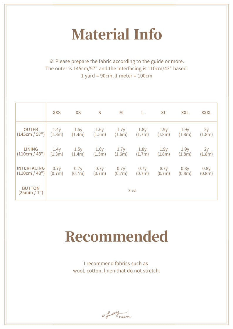 • Interfacing(Width 110cm/43”): 0.7-0.8y(0.7-0.8m)