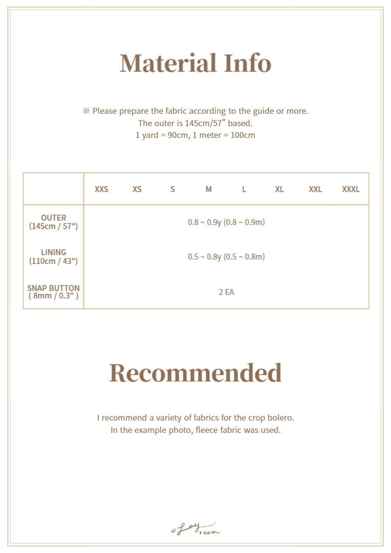 • Recommended fabric: I recommend a variety of fabrics for crop bolero. In the example photo, fleece fabric is used.