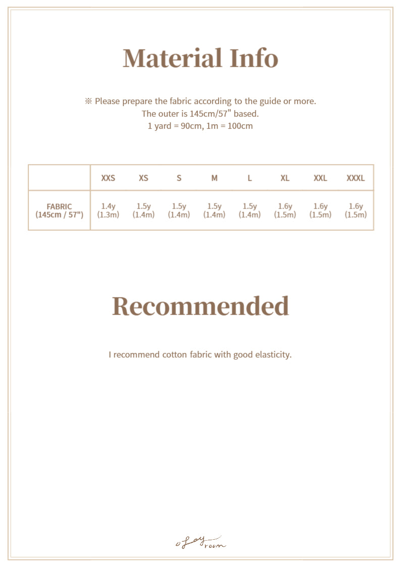 • Recommended fabric: Stretchy cut and sew fabrics.