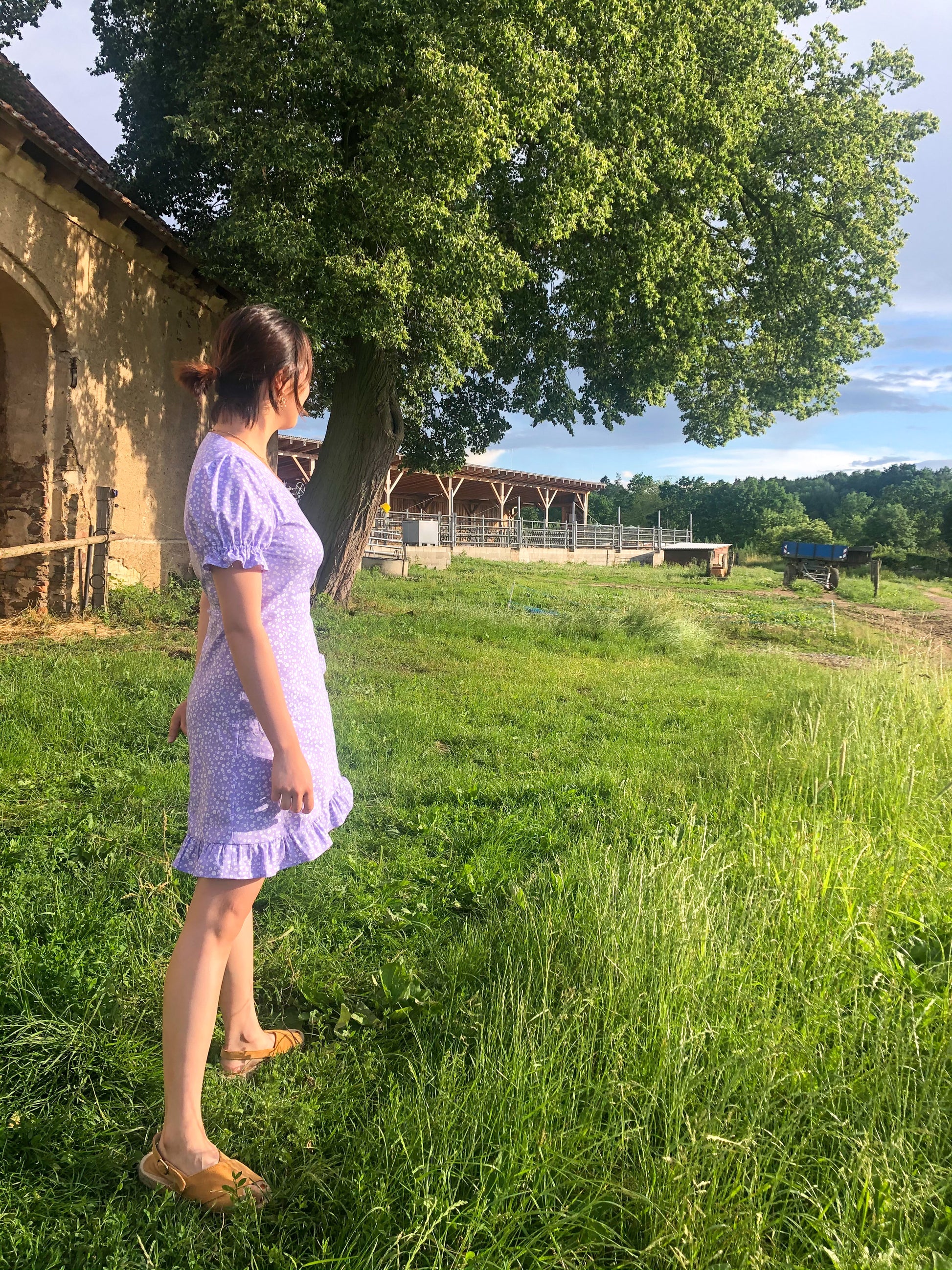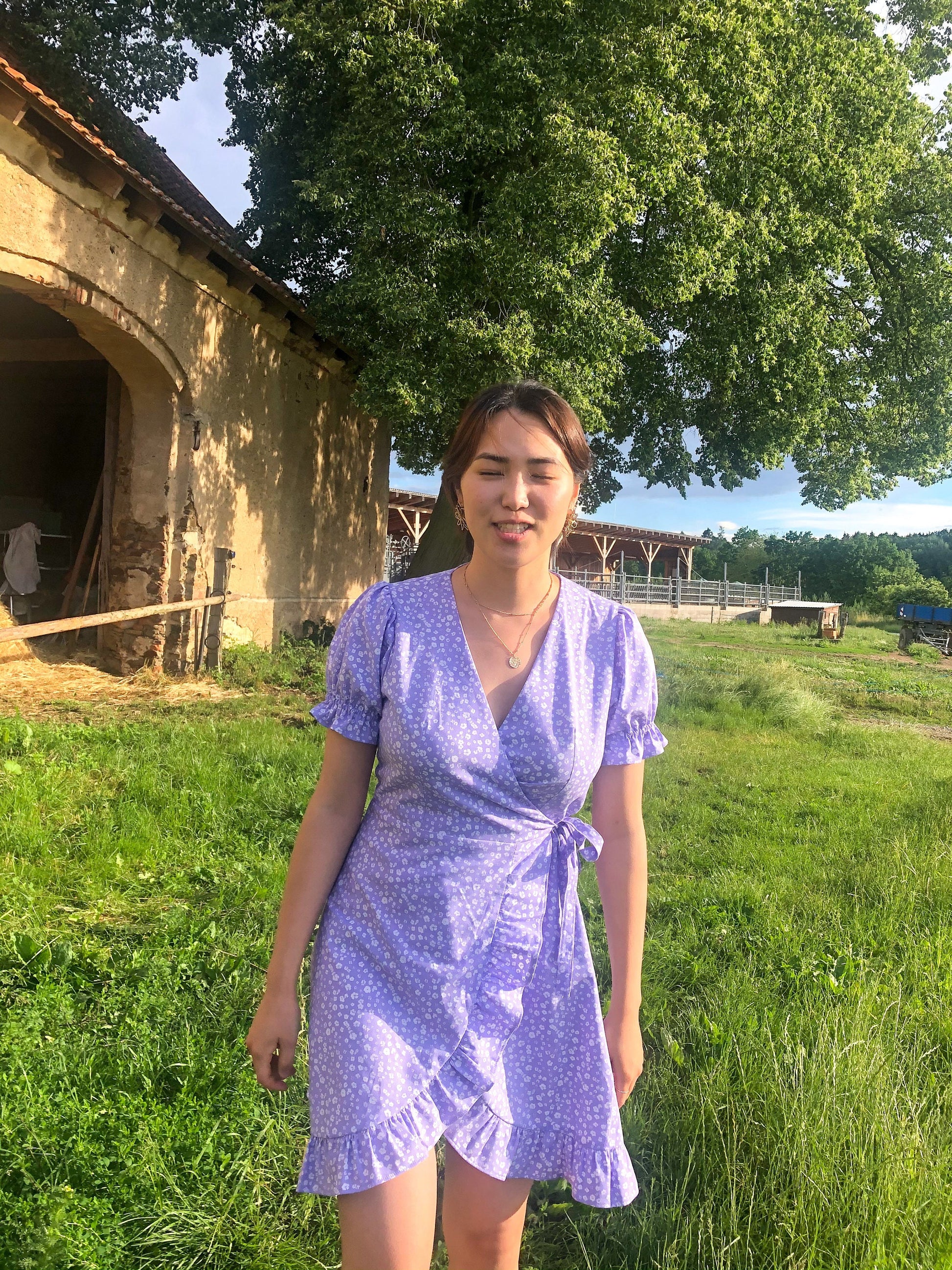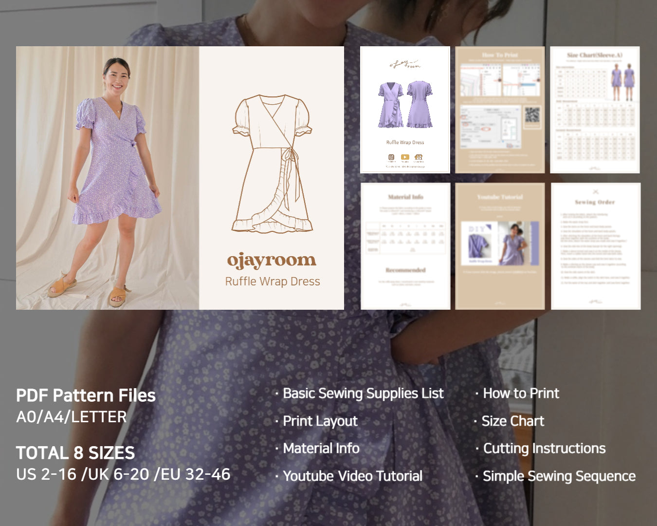 Ruffle Wrap Dress is a clothes that make you lovely the moment you wear it! The waist strap is put in the hole on the side of the waist and wrapped around the waist, so you can wear it comfortably according to your waist size. The puff sleeves and ruffle details show a lovely feeling, and the waist line is utilized with a waist dart to bring out a feminine design. You can make a dress with a different feel with two designs for the sleeves. The sewing difficulty is 'Pre-Intermediate'.