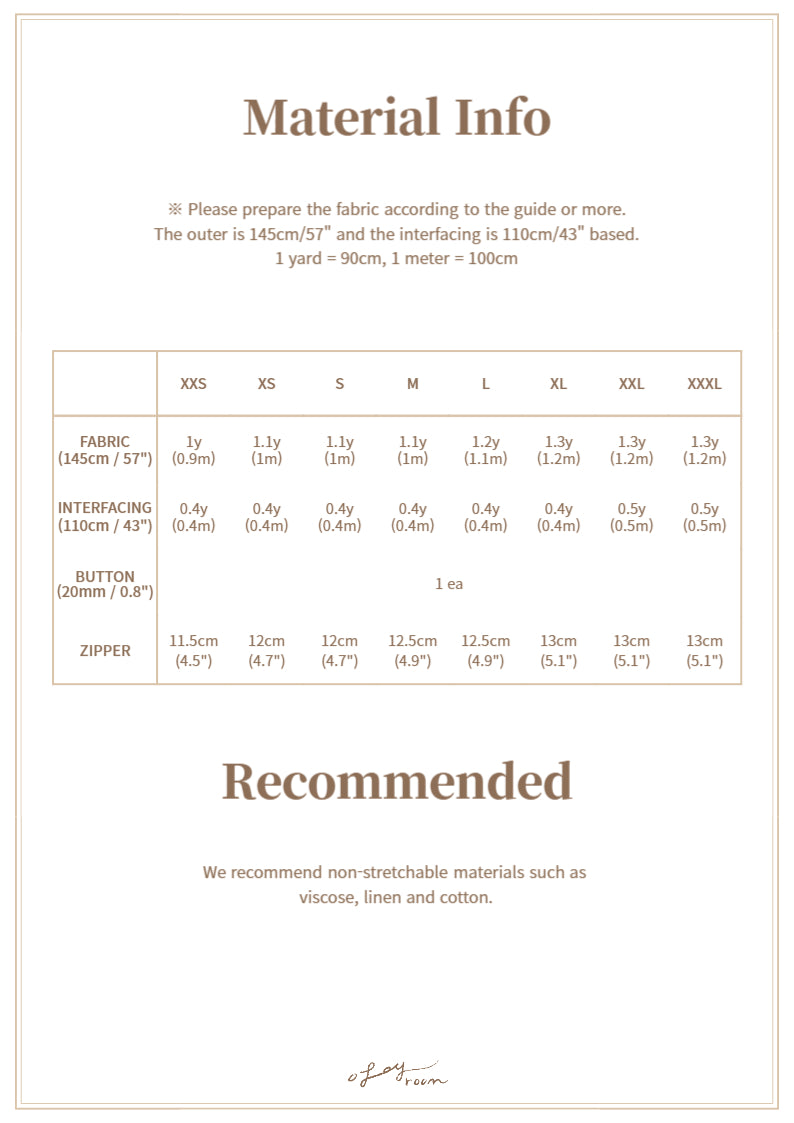 • Interfacing(Width 110cm/43”): 0.4-0.5y(0.4-0.5m)